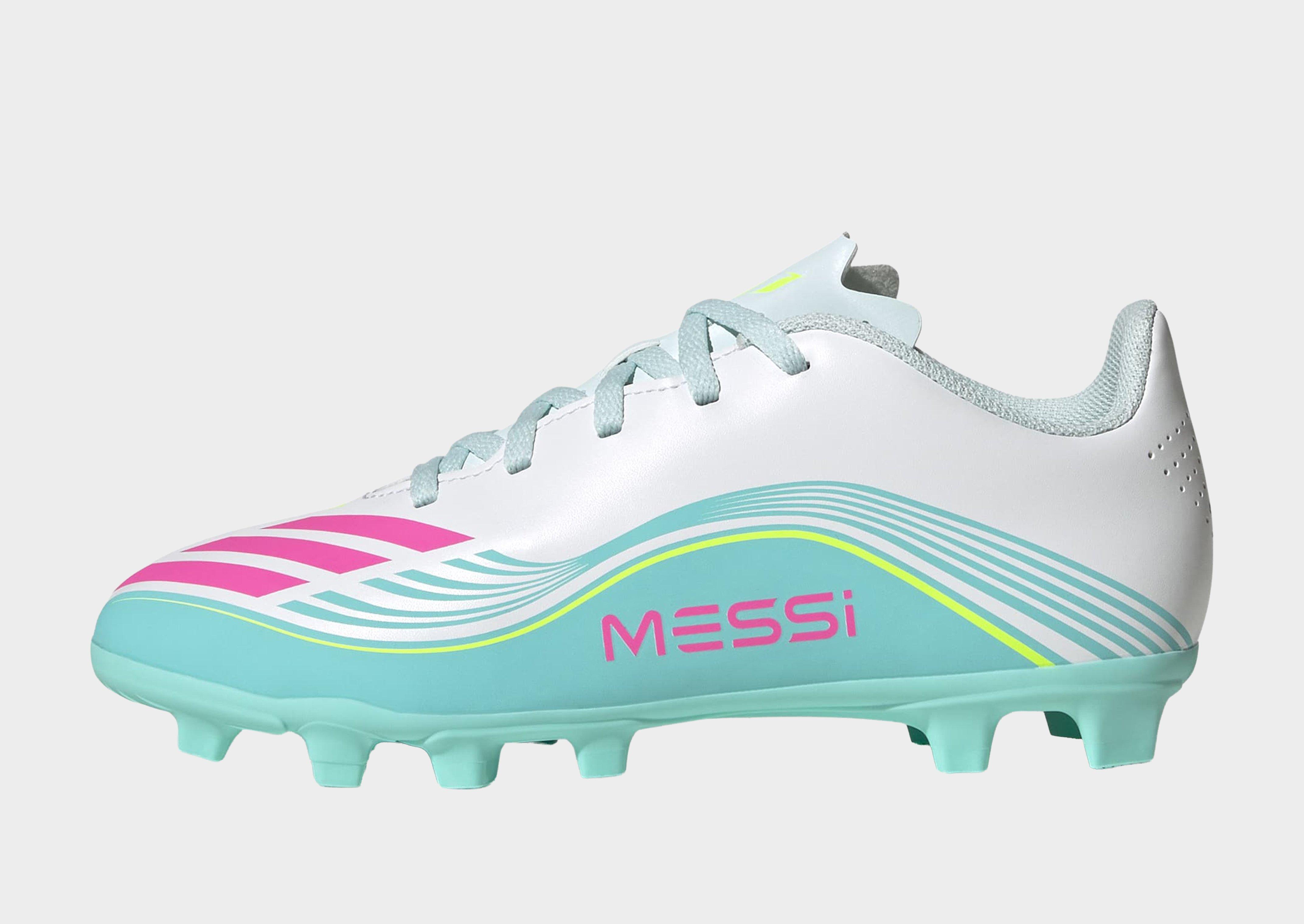 Boss the pitch like the GOAT. These men's F50 Messi League FG/MG football boots from adidas have a durable HybridTouch upper for a close first touch. They have a textile sockliner for a snug fit, while underfoot, Sprintplate 360 technology and non-removable studs bring grip and acceleration on firm to medium ground. They land in Footwear White, Lucid Pink and Flash Aqua, with signature branding and the Messi logo. | JQ0954