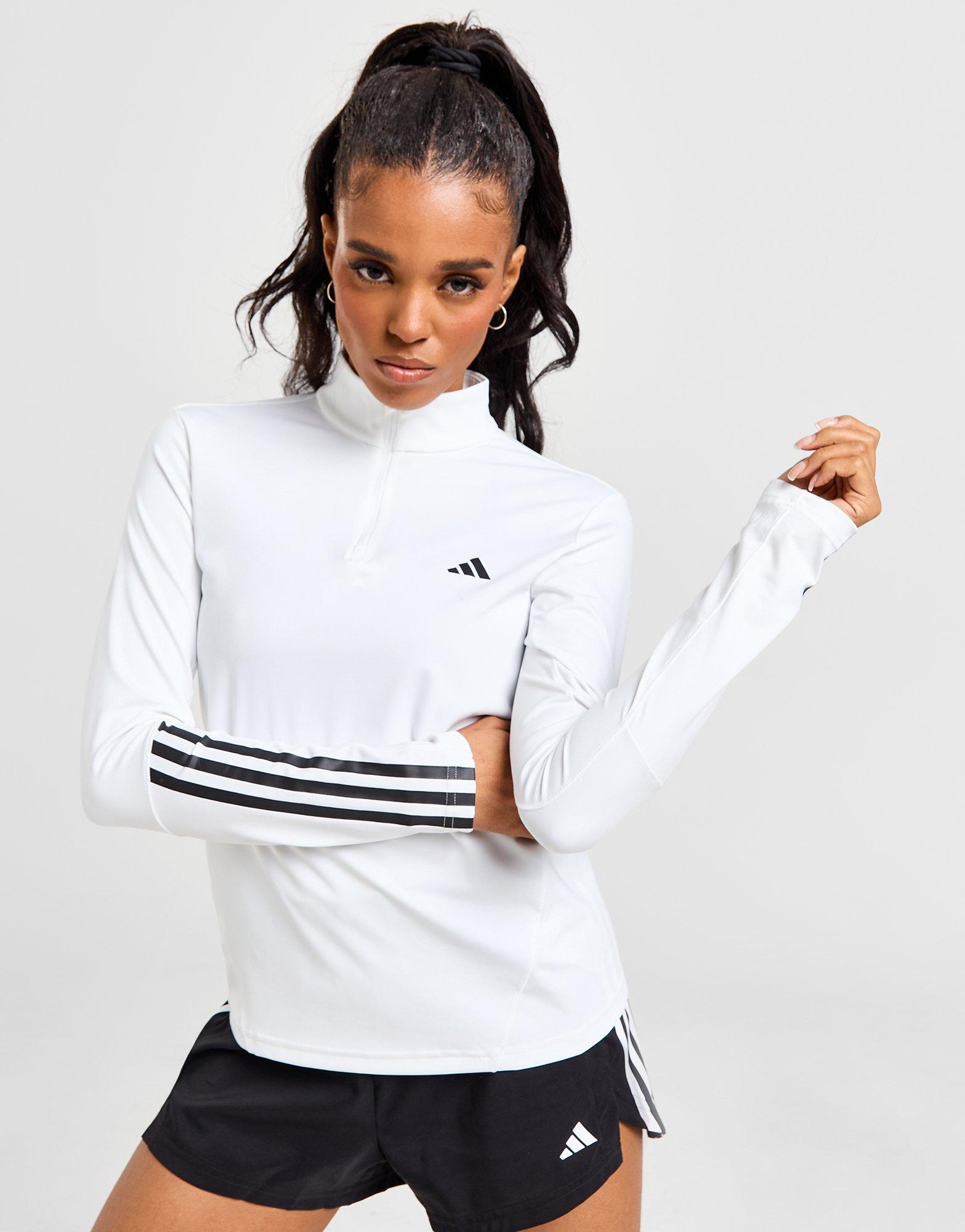 Update your training essentials with this women's Hyperglam 1/4 Zip Top from adidas. In a White colourway, this slim-fit top is made with a smooth, stretch-woven poly for lasting comfort. Equipped with sweat-wicking AEROREADY tech to keep you cool and dry, it features a quarter zip fastening with a stand-up collar to adjust your airflow. It has long sleeves for streamlined coverage, and is finished with signature adidas branding throughout. Machine washable. | Our model is 5'7" and wears a size small. | IN6840