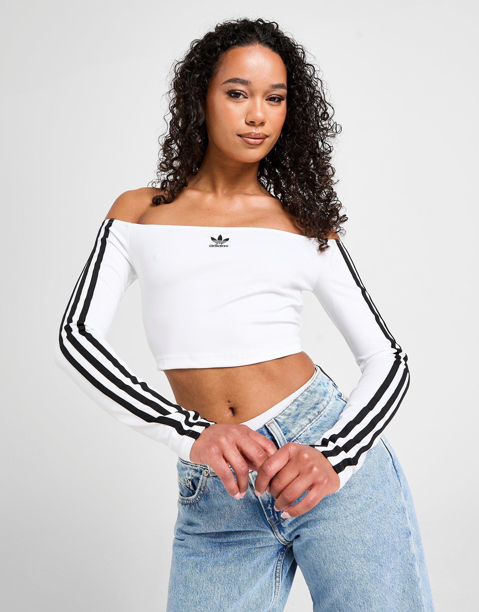 Add a fresh look to your staple cuts with this women's 3-Stripes Bardot Long Sleeve Top from adidas Originals. In a White colourway, this slim-fit top is made with smooth, stretchy recycled polyester for lasting comfort. It features a sleek bardot neckline and long sleeves, with a cropped hem. Finished with contrasting 3-Stripes down the sleeves and the iconic adidas Originals logo at the chest. Machine washable. | Our model is 5'7" and wears a size S. | JD0275
