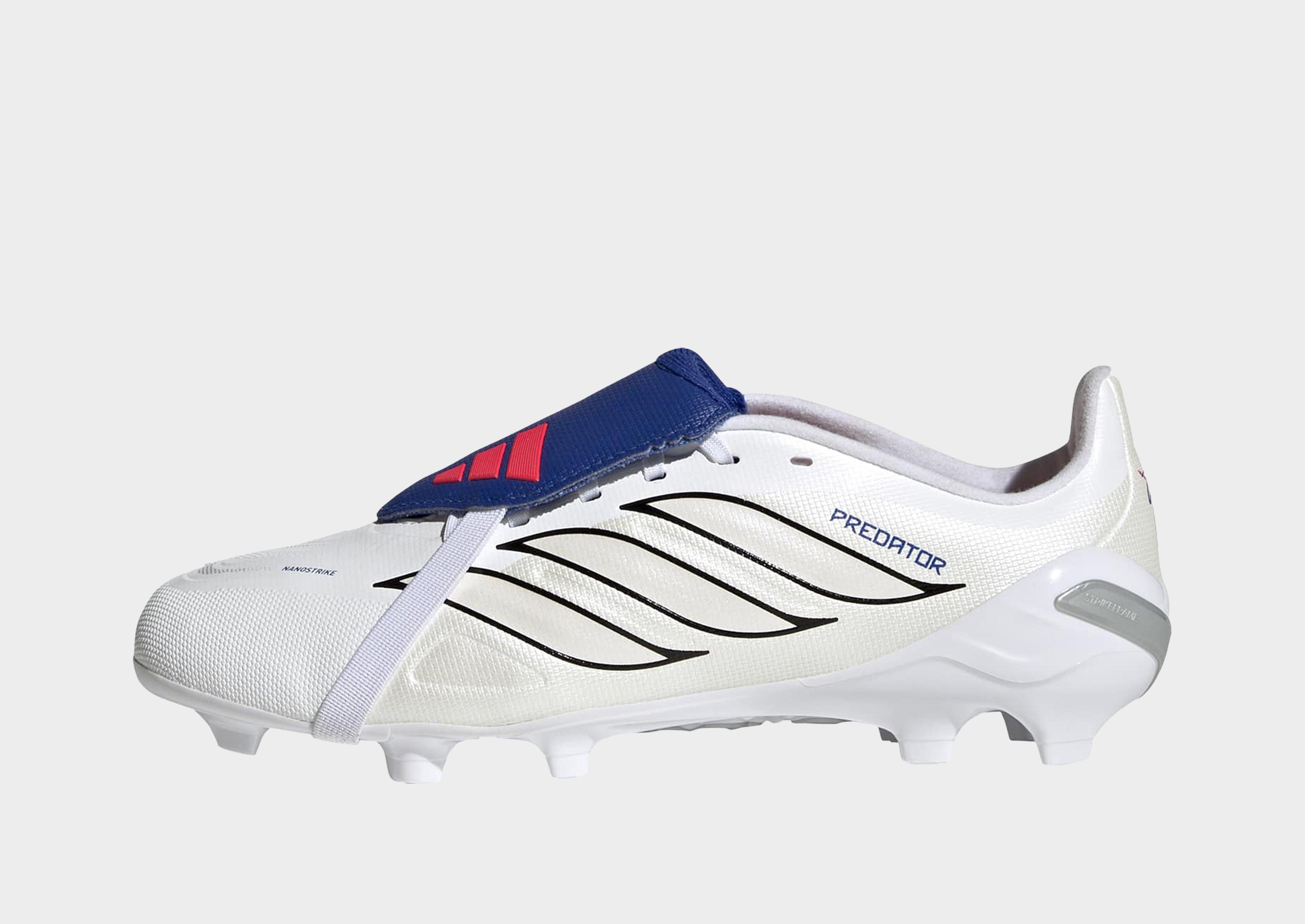 Put defenders on notice in these children's Predator Club FG football boots from adidas. In white and Team Royal Blue, these boots have a light, durable and textured Nanostrike upper for added accuracy to every shot and pass. The tongue has a classic strap to fold it down and create a bigger sweet spot. Underfoot, the Strikeframe outsole plate delivers standout traction on firm ground pitches. Finished with curved 3-Stripes and the iconic Performance logo. | JR5889
