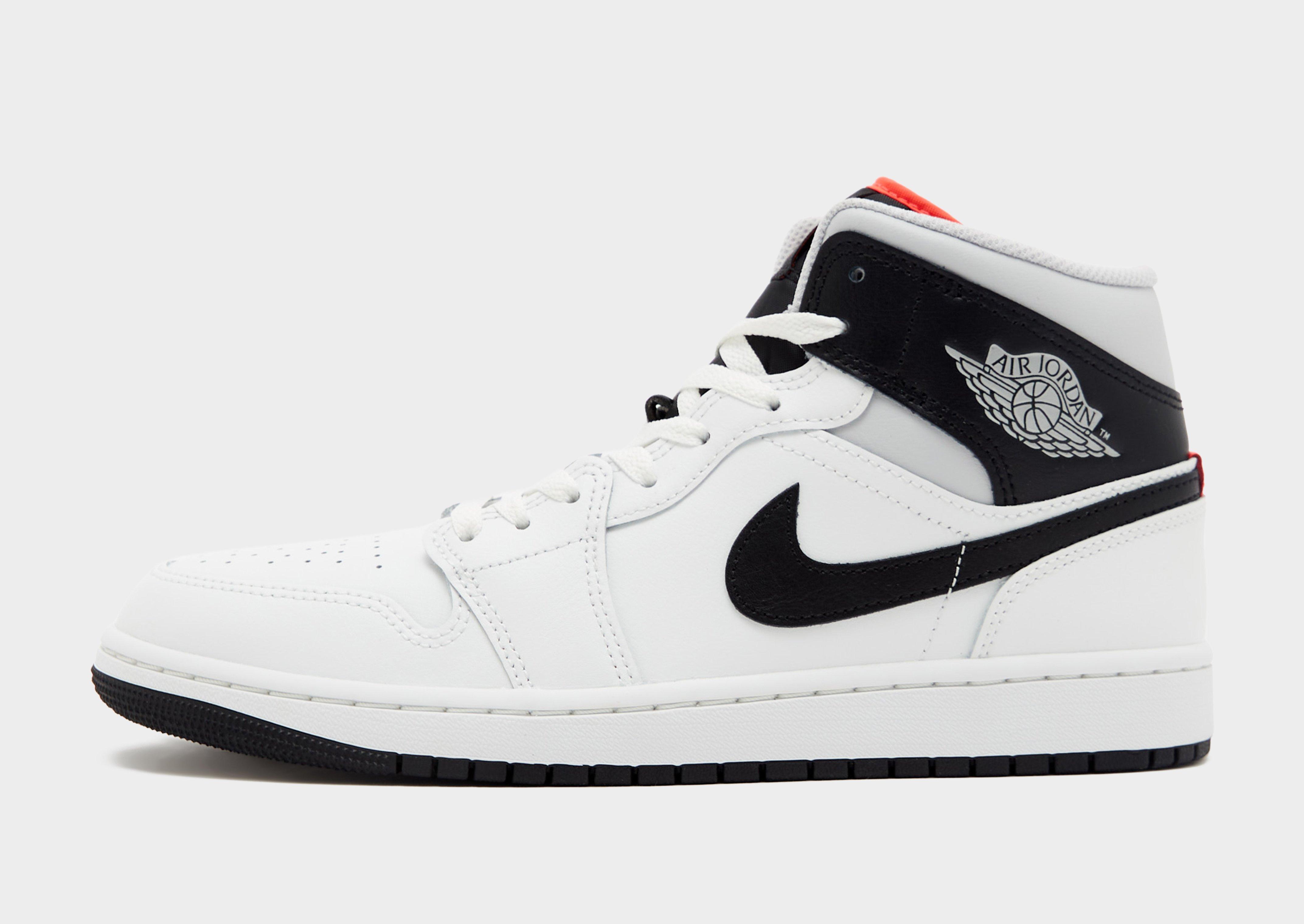 Lace up in a legendary style. These men's Jordan Air 1 Mid trainers land in Summit White with black accents. They've got a real and synthetic leather upper, with a padded mid-top collar. Classic laces lock you in. And signature Nike Air cushioning keeps you comfy. With a rubber tread for grip, they're signed off with iconic Nike x Jordan logos.