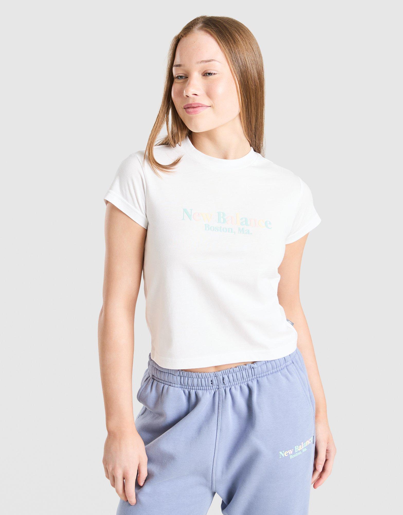 Keep the staples fresh this season with this junior girls' Tonal Logo Baby T-Shirt from New Balance. In white, this slightly cropped tee has shorter sleeves and a crew neckline for a slimmer fit. Made from soft cotton, it's finished with pastel New Balance branding on the front. Machine washable.