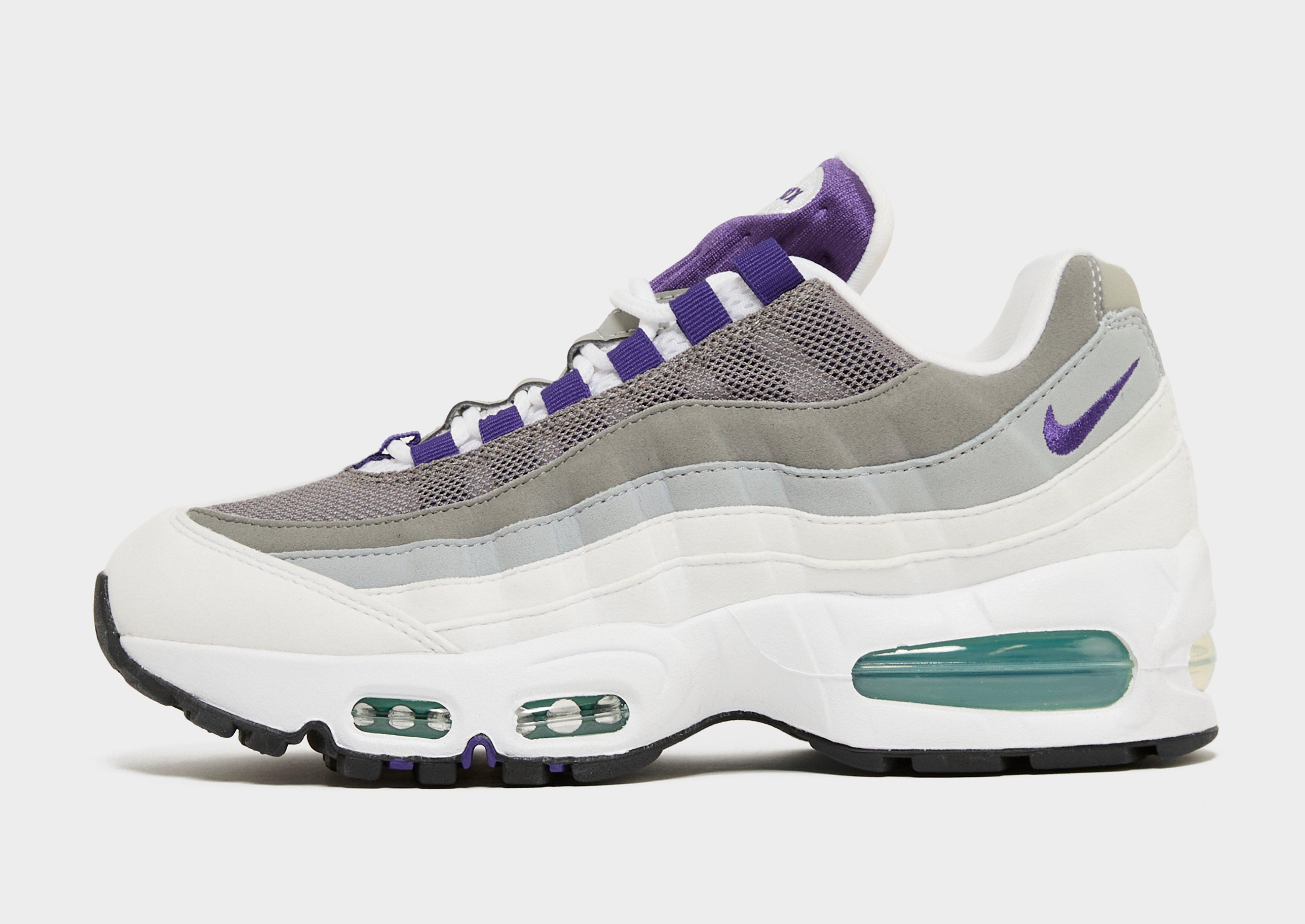 Lace up in signature Swoosh style. These women's Air Max 95 sneakers from Nike are cut from breathable mesh and synthetic leather in the upper. Inspired by human anatomy, they have a padded collar for support. Underfoot, soft foam works with Max Air cushioning for a smooth ride. The grippy rubber outsole has flex grooves for traction. They land in white, Court Purple and Emerald Green, with signature branding.