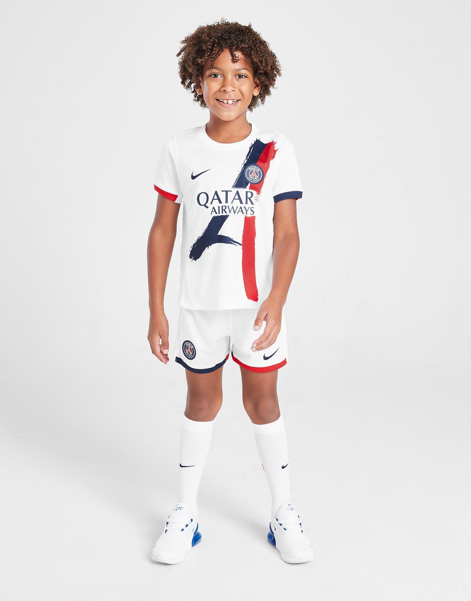 Little one mad about the Ligue 1 giants? Then let them rep this children's Paris Saint Germain 2024/25 Away Kit by Nike. This downsized kit features a White shirt with an Effiel Tower graphic to the front, with matching shorts that have an elastic waistband for support. The shirt and shorts are cut from a smooth poly fabric that uses sweat-wicking Dri-FIT tech to keep them cool. With matching socks made from a soft blended fabric to complete the look, it's finished up with PSG and Nike branding throughout. Machine washable.