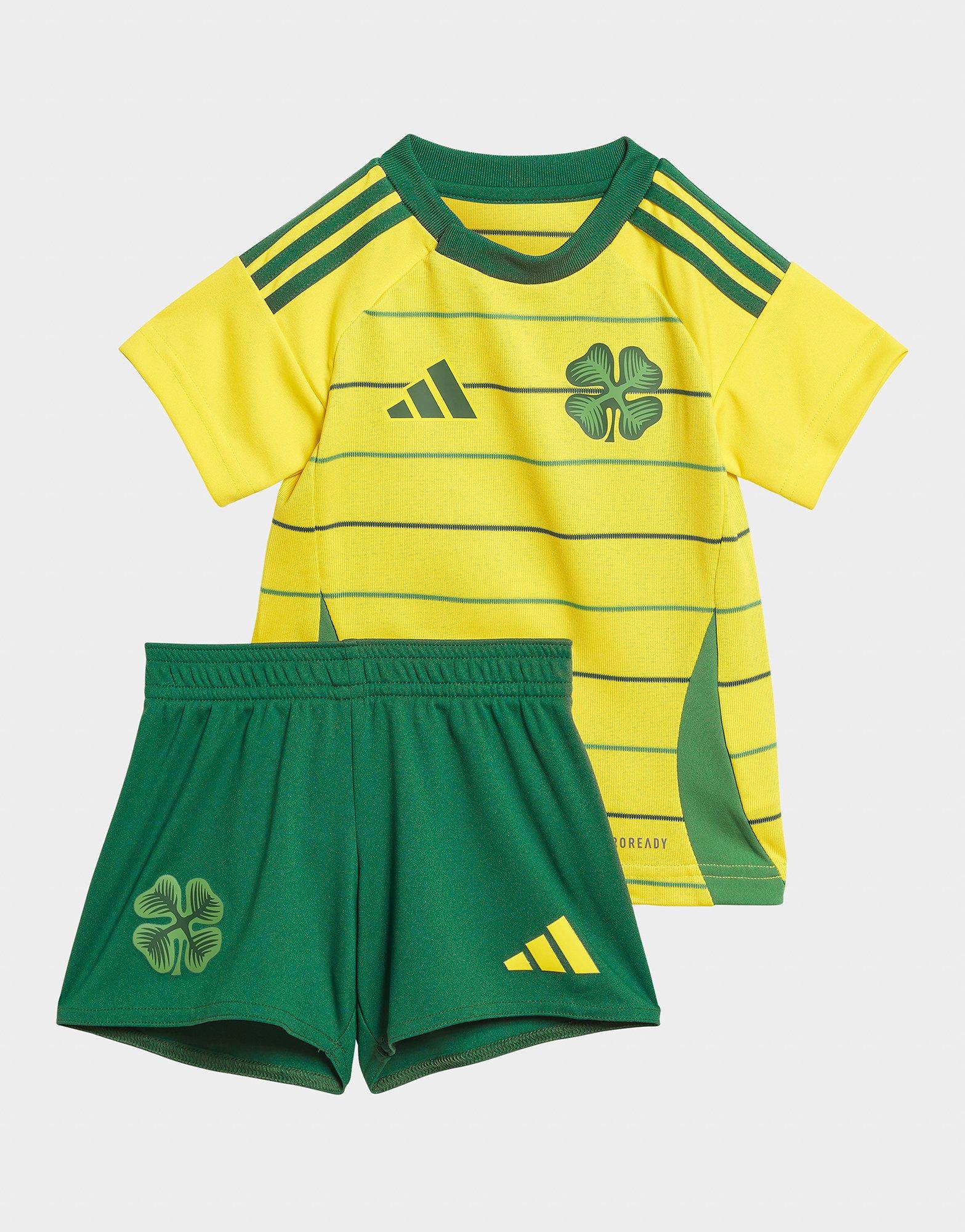 Get your smallest supporter ready for matchdays with this infants' Celtic 2024/25 Away Kit from adidas. This downsized kit is made with ultra-smooth, lightweight recycled polyester for lasting comfort, with built-in AEROREADY technology to wick away sweat. It includes a Team Yellow football shirt with a classic crew neckline and short sleeves, and snap buttons on the shirt for easy on-off. The matching shorts come in a Team Dark Green colourway, with an elastic waistband for a snug feel. Finished with adidas branding throughout, and signature Celtic team details. Machine washable. | IU1303